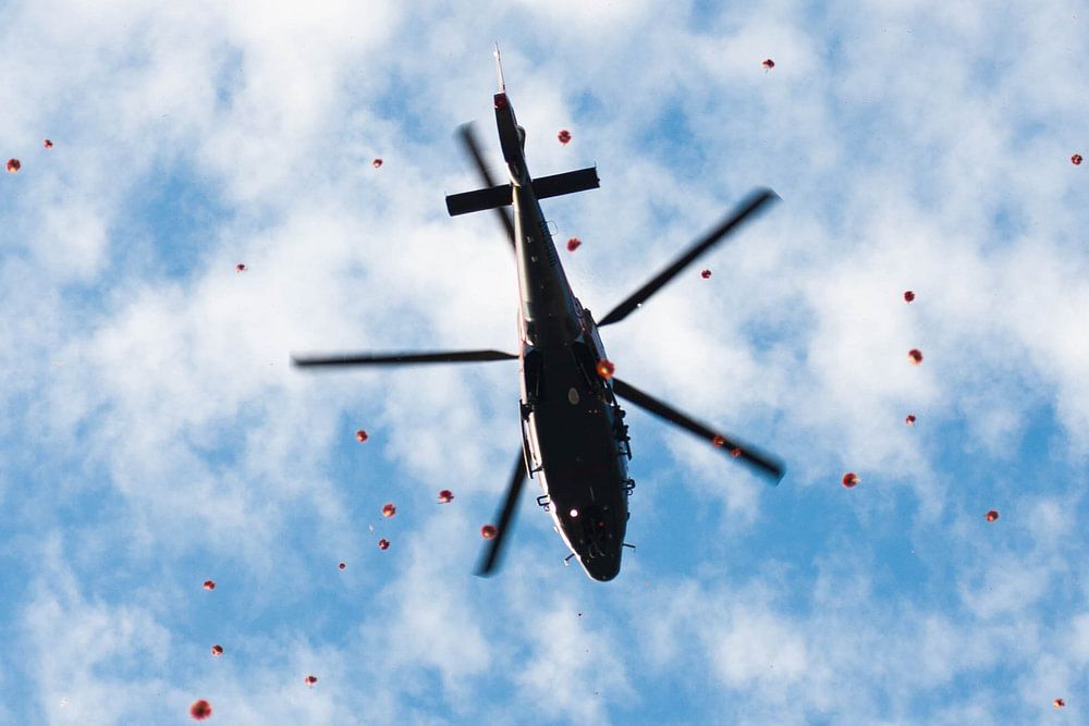 Regen van oranje bloemen vanuit een helikopter recht boven.