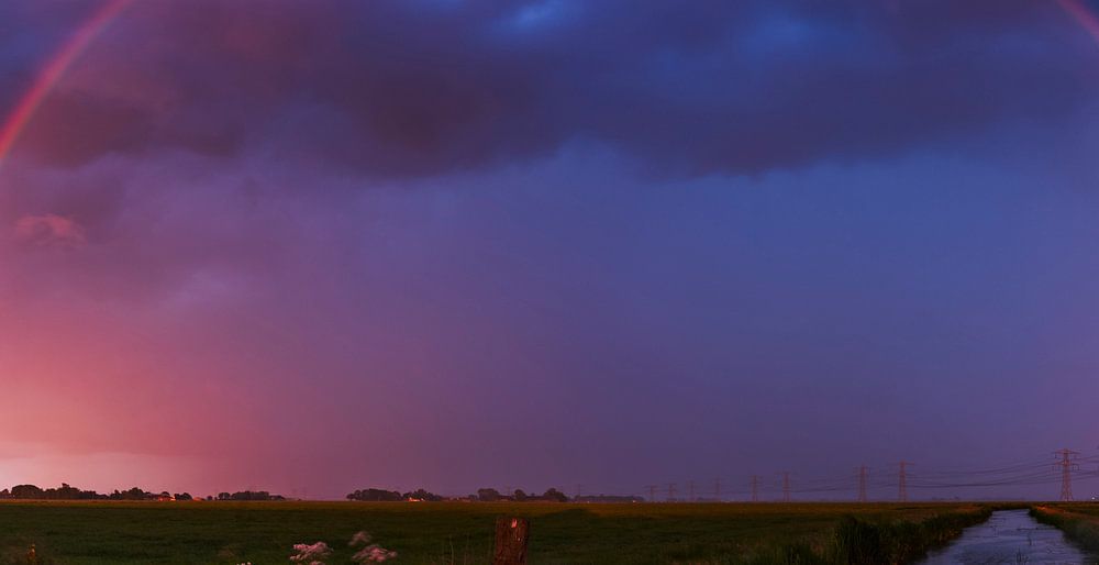 Schöner voller Regenbogen nach einer Arcuswolkenformation kam auf. Da die Sonne am Horizont stand, war der Regenbogen extra hoch und von schöner Farbe. Schuss im Polder Mastenbroek