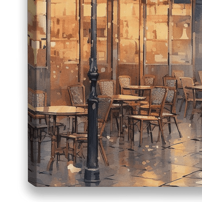 Rainlight - Diese stimmungsvolle Szene zeigt eine einladende Stadtterrasse in einem beleuchteten Café, die an einem regnerischen Tag in den warmen Schein der Innenbeleuchtung getaucht ist. Der impressionistische Stil erweckt die nassen Pflastersteine, das reflektierte Licht und das Laub mit einer Farbpalette zum Leben, die satte…
