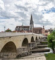 Regensburg mit der Donau und dem Dom St. Peter und der Steinernen Brücke an einem Sommertag