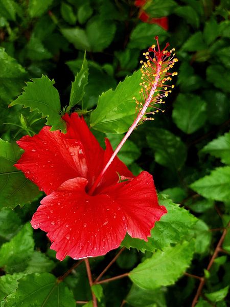 Eine auffällige Fotografie einer roten Hibiskusblüte, die von Regentropfen bedeckt ist, vor üppigem grünen Laub. Der lebhafte Kontrast und die natürlichen Details unterstreichen die tropische Eleganz dieser Blüte. Ein erfrischendes botanisches Kunstwerk, perfekt für Naturliebhaber und florale Wanddekorationen.