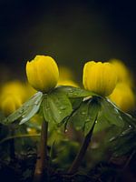 Regentropfen auf Winterlingen im Frühling von Krümel_Visions