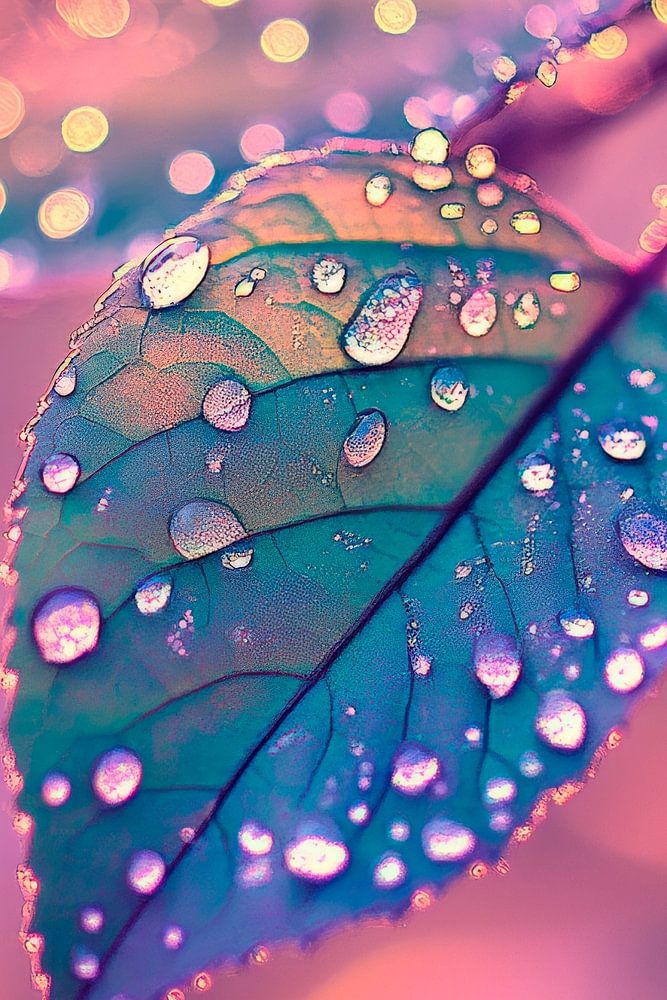 Sanfte Tropfen funkeln auf den zarten, türkisfarbenen Blättern, während ein faszinierendes Spiel aus Licht und Farben eine traumhafte Atmosphäre erzeugt. Der sanfte Schimmer und die harmonische Komposition verleihen jedem Raum eine beruhigende Eleganz. Ideal für das Schlafzimmer oder das Wohnzimmer, wo Ruhe und Naturverbundenheit einen besonderen Platz finden.