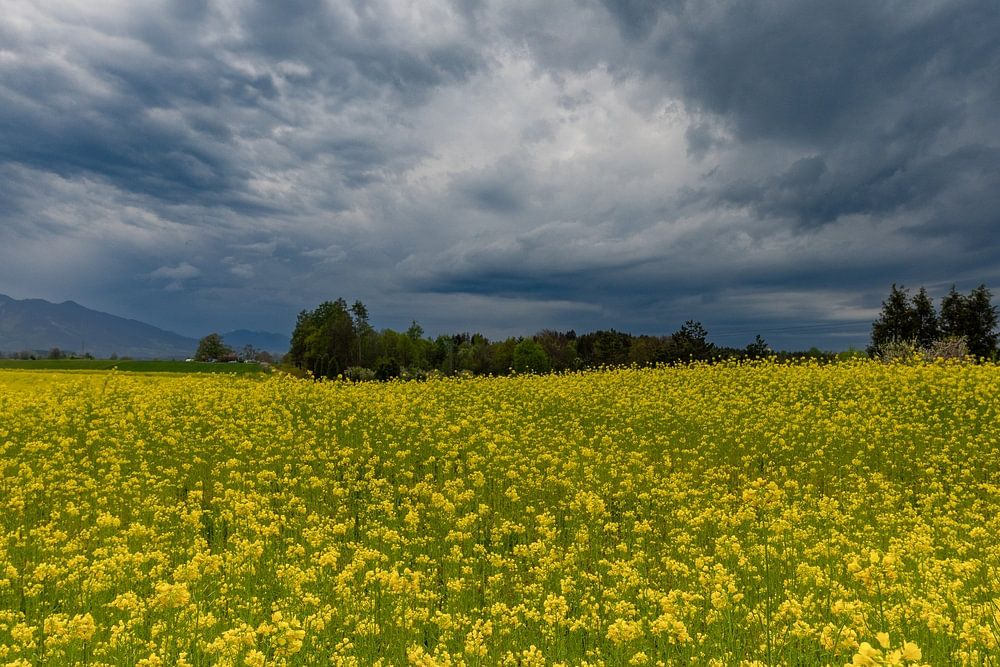 Ein wunderbarer Kontrast bildet das hellgelbe Rapsfeld zum bewölktem Himmel. Man blickt über das weite Feld, der Himmel wirkt dramatisch, es riecht schon nach Regen.