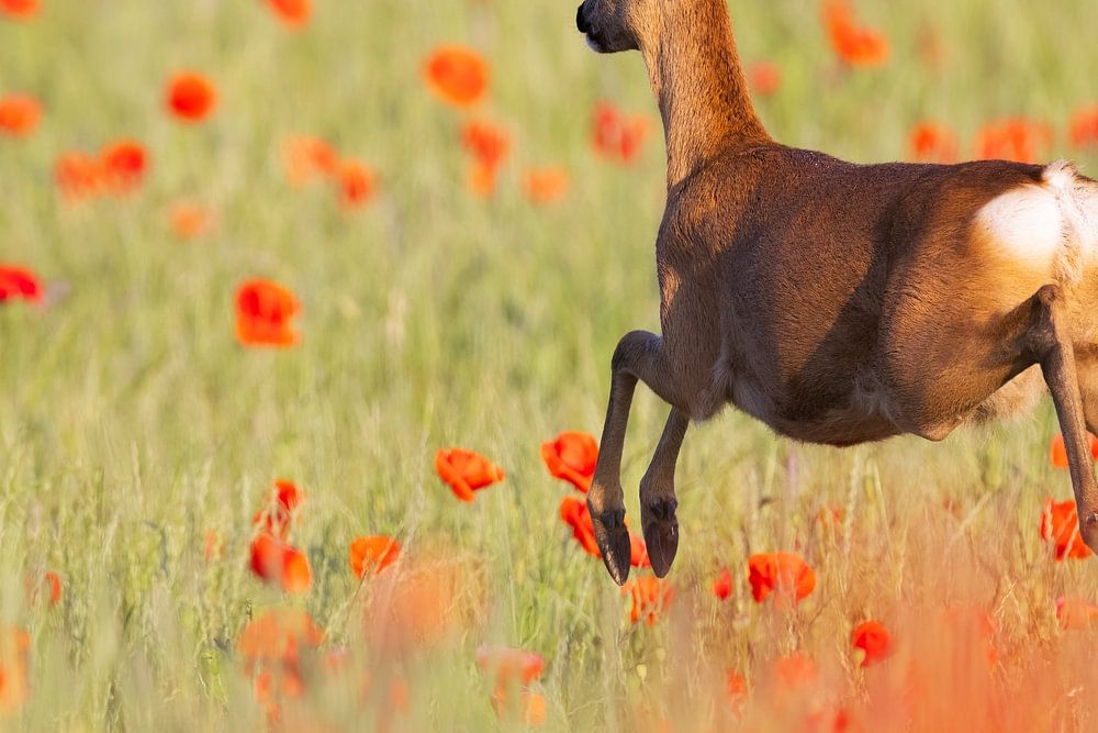 Das Reh ist auf dem Sprung durchs Feld, das mit Mohnblumen getupft ist.