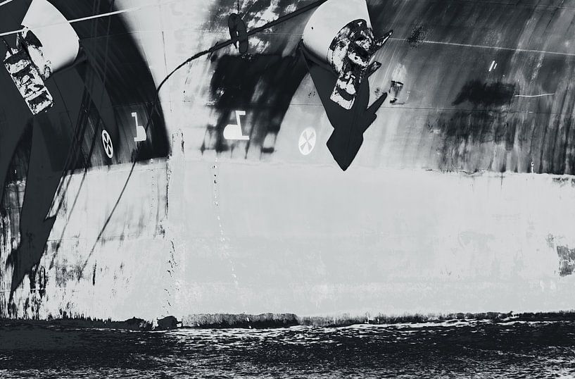 Der Bug eines im Hafen vertäuten Schiffes bildet ein fast abstraktes Bild, aber genau dieser rohe Charakter macht die Hafenfotografie so stark. In Schwarz-Weiß sind die harten Linien und Formen noch deutlicher zu erkennen: der Bug mit seinen Ankern, Trossen und Rattenschilden, erkennbar, aber…
