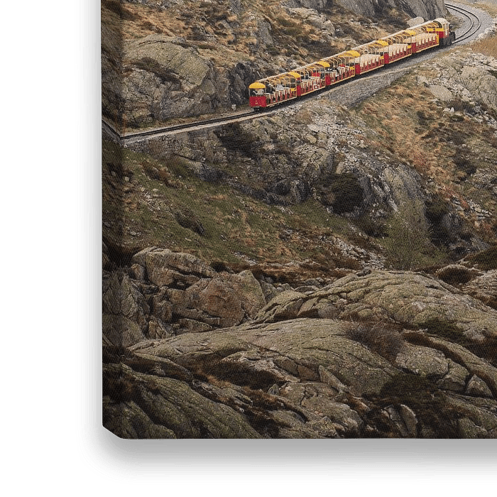 Dieses Bild nimmt Sie mit auf eine atemberaubende Reise durch die majestätischen Pyrenäen, wo sich die Natur in ihrer ganzen rauen Pracht zeigt. Auf dem Bild sehen wir einen farbenfrohen Zug, der sich elegant an den steilen, felsigen Hängen der Berge entlangbewegt. Die rötlich-gelben Waggons bilden einen lebhaften Kontrast zu den erdigen Tönen der Landschaft und lassen den Zug als lebendige Linie durch das Herz dieser unberührten Wildnis auffallen.