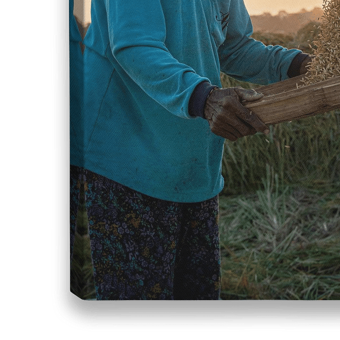 Eine indonesische Frau auf Bali erntet ihr Reisfeld bei Sonnenuntergang. Die Sonne kommt gerade durch den in der Luft fliegenden Reis. Die Frau bläst sanft durch den Reis. Porträtfotografie des täglichen Lebens in Ubud.