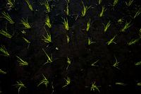 Abstraktes Foto von frischen, hellgrünen Reispflanzen, die bei Sonnenaufgang belichtet wurden. Pflanzen heben sich stark von der dunklen Erde ab.