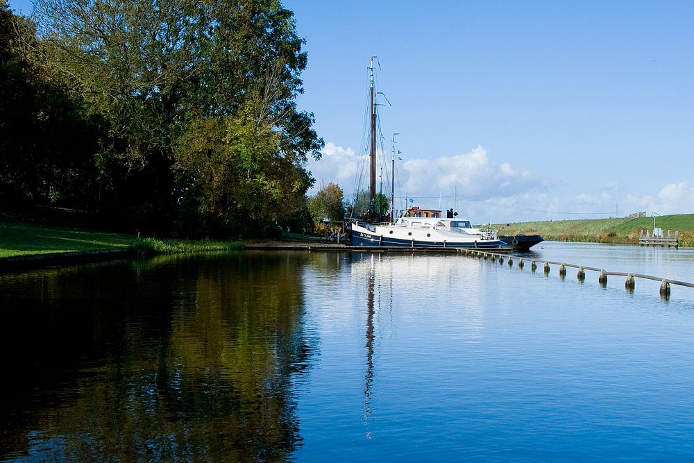 Bij het haventje van Garnwerd ligt een strandje. Zwemmen tussen de schepen in het Reitdiep