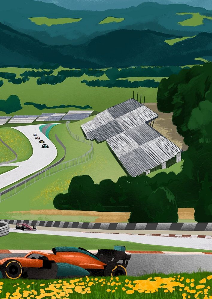 Der Red Bull Ring in Österreich, Formel-1-Rennstrecke. Schöne Illustration der Berge und Felder, auf denen sich die Rennstrecke befindet.
