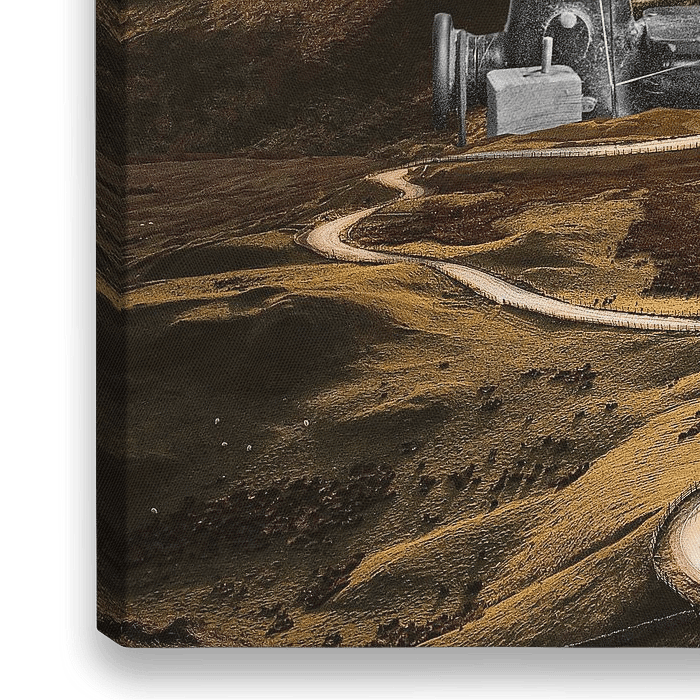 Eine Collage; Ich sah einen Riss in dieser surrealen Landschaft und fand ein altes Foto von jemandem, der auf diese Weise reparieren konnte, indem er die beiden Teile zusammennähte
