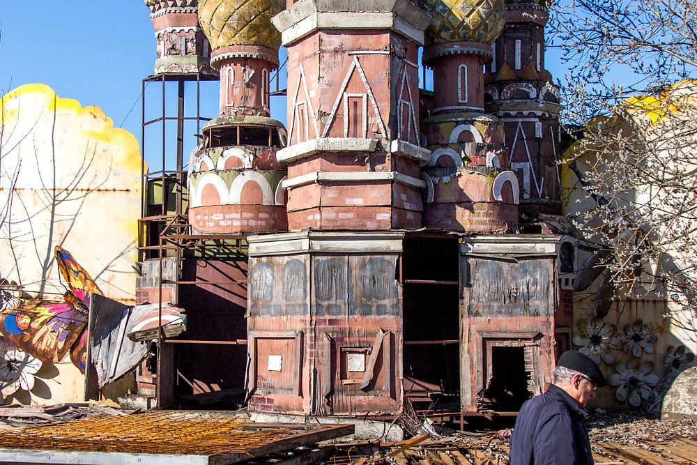 Eine Nachbildung der berühmten Kathedrale der Fürbitte der Gottesmutter auf dem Roten Platz in Moskau steht in einer Ecke eines Touristenmarktes.