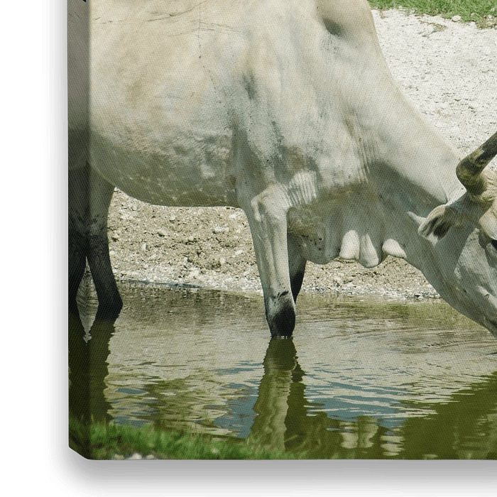 Die gehörnte senegalesische Kuh mit dem großen weißen Geweih trinkt am Flussbett, wo sie im zentralen Tal des Sénégal-Flusses Salz produziert.