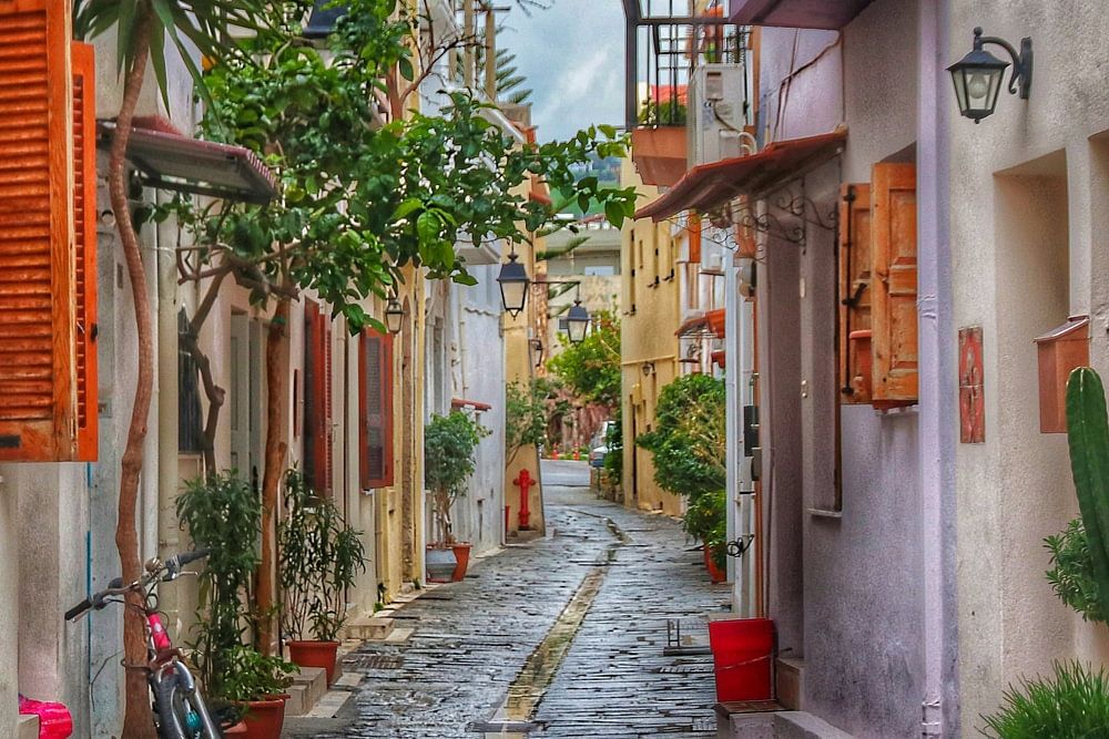 Dieses stimmungsvolle Foto wurde in der Stadt Rethymnon auf Kreta, Griechenland, aufgenommen und zeigt eine der charakteristischen, authentischen Straßen der Stadt. Nach einem heftigen Regenguss kam auf diesem Foto die Sonne wieder zum Vorschein.