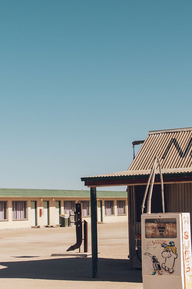 Eine alte Tankstelle auf der Nullarbor Plain in Australien. Dieser Ort ist ikonisch, weil er früher die einzige Tankstelle an dieser Straße war. Die längste Straße in Australien, die den Westen mit dem Osten verbindet.