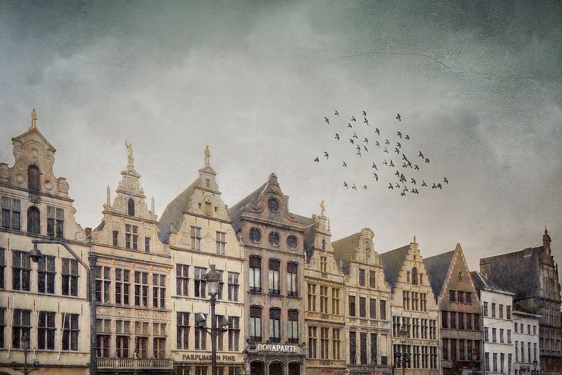 Die Fassaden stehen dicht beieinander und verstärken gegenseitig ihre Präsenz. Details im Stein und in den Skulpturen erhalten durch das einfallende Licht zusätzliche Tiefe. Über den Gebäuden fügt der Vogelschwarm einem permanenten Dekor ein temporäres Element hinzu. Der Kontrast zwischen Bewegung und Masse verleiht dem Bild…