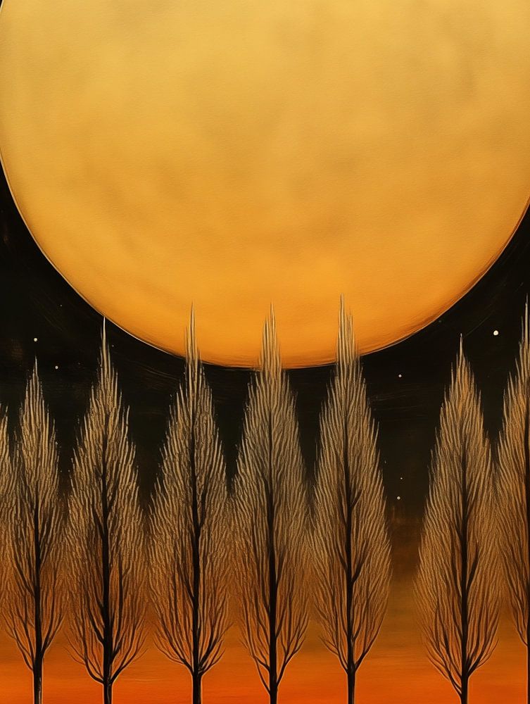 Gigantisches Bild mit Mond und Bäumen bei Nacht, das eine elegante und luxuriöse Ergänzung für jeden Raum darstellt. Mit seinem einzigartigen und stilvollen Look ist es ein echter Blickfang. Die brillanten Minimalfarben und das ungewöhnliche Design machen dieses Kunstwerk zu 100% einzigartig und originell. Es ist der perfekte Fotodruck, um Ihr Interieur zu vervollständigen.