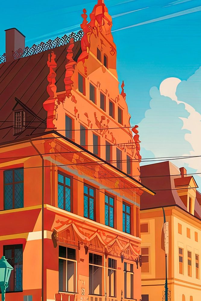 Lebendige Farben und ein strahlend blauer Himmel umrahmen die prächtigen Fassaden im Herzen von Riga. Detailreiche Türme und geschwungene Giebel erzählen Geschichten vergangener Zeiten, während der schmale Straßenverlauf zum Flanieren einlädt. Ein Hauch von besonderem Flair durchdringt die Szenerie und macht diesen Ort zu einem faszinierenden Reiseziel.
