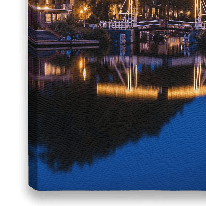 Beim Rijksmunt werden die Münzen in den Niederlanden seit 1567 geschlagen . Das Gebäude ist ein nationales Denkmal. Der Abel-Tasman-Brücke (links) uber der Leiden Rhein ist nachts beleuchtet. Die Munt Brücke über den Merwede auf der rechten Seite ist noch teilweise sichtbar.