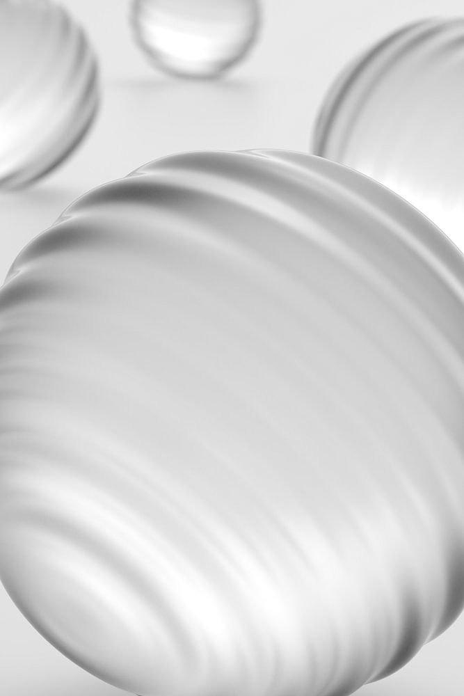 Vier gerenderte Glaskugeln mit Rillen und viel Tiefenunschärfe.