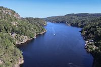 Die Ringdalsfjord-Landschaftsansicht fängt die atemberaubende Schönheit des Fjords von der alten Svinesundbrücke (Gamla Svinesundsbron) an der Grenze zwischen Norwegen und Schweden ein. Im ruhigen Wasser des Fjords spiegeln sich der strahlend blaue Himmel und das üppige Grün, das ihn umgibt. Ein einsames Boot verleiht der Szene einen…