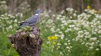 Midden-Delfland, eine Oase der Ruhe und des Friedens, liegt zwischen Delft, Rotterdam, Schiedam und Vlaardingen. Auf einer Kopfweide posiert eine Ringeltaube vor einem Meer von Blumen.