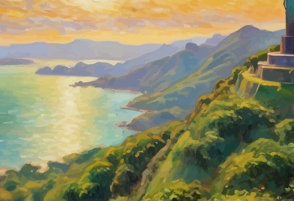 Die Christus-Erlöser-Statue erhebt sich über einer in goldenes Licht getauchten Stadt, während sich die Hügel und die Küste Rios bis zum Horizont erstrecken. Impressionistische Pinselstriche verweben warme Sonnenuntergangstöne und tiefes Ozeanblau und beschwören sowohl Frieden als auch Feierlichkeit in dieser ikonischen brasilianischen Ansicht.