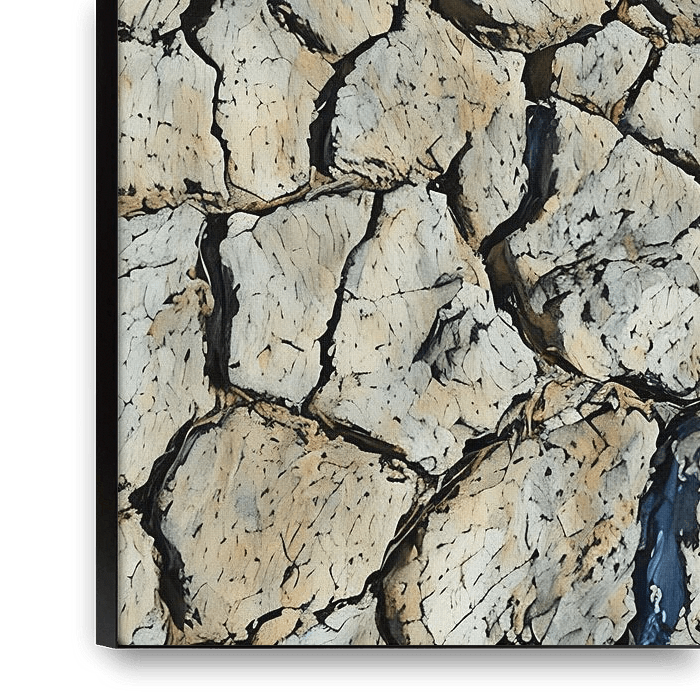 Das Bild zeigt eine Nahaufnahme von rissiger Erde, die ein Netz komplizierter Risse und Spalten offenbart. Die vorherrschende Farbe ist ein gedämpftes Grau mit subtilen Variationen in Farbton und Textur. Die Risse sind tief und ausgeprägt und vermitteln einen Eindruck von Trockenheit und Dürre. Die Gesamtstimmung ist von Trostlosigkeit…