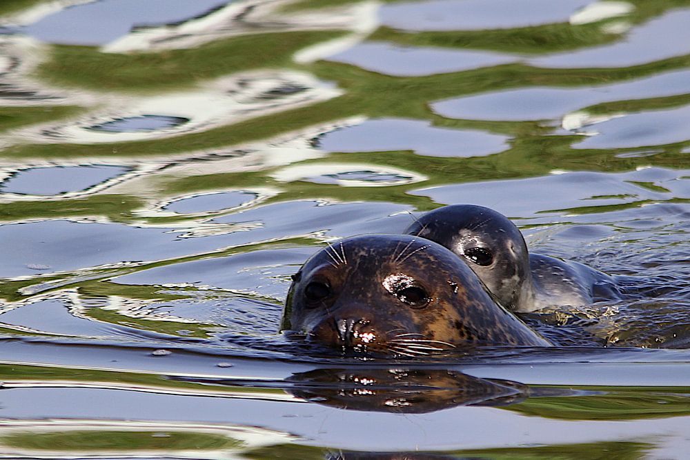Robbenmutter zusammen mit ihrem Jung/Welpen beim Schwimmunterricht im Wasser. Der Welpe ist einige Wochen alt. Der Welpe wurde in den Binnengewässern in einem Wohngebiet geboren. Einzigartig in den Niederlanden! Die Mutter und ihr Welpe behalten alles neugierig im Auge.