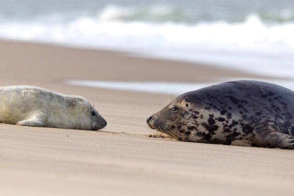 Schöner Moment einer Kegelrobbe zusammen mit ihrem Jungen am Strand von Noordzij. Die Kegelrobbe säugt ihr Junges in den ersten 4 Wochen seines Lebens, danach muss das Jungtier allein zurechtkommen. In den Niederlanden gibt es zwei Arten von Siegeln. Der Seehund und die Kegelrobbe, die auf diesem Foto zu sehen ist. Eine Besonderheit der Kegelrobbenwelpen ist, dass sie mit einem wunderschönen weißen Fell geboren werden, das auch als Lanugo bezeichnet wird. Es ist ein Babyfell, das den Körper in der Zeit warm halten soll, in der das Jungtier noch eine dicke Fellschicht entwickeln muss, die es als erwachsene Robbe warm halten wird. Bis dahin schützt der Lanugo den Welpen vor der Kälte an Land.