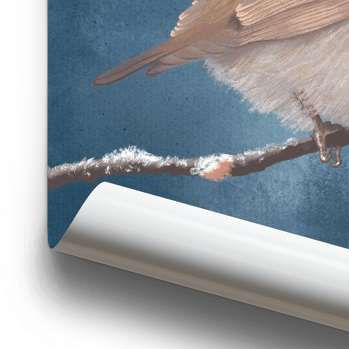 Pastellzeichnung eines Robin, das im Winter auf einem verschneiten Zweig sitzt. Schneeflocken sind sogar auf seinem Kopf. Digital gezeichnet mit Pastellpinseln. Das Robin hat einen schönen Kontrast zum blauen Hintergrund.