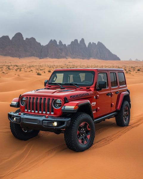 Ein auffallend roter Jeep Wrangler fährt durch den goldenen Wüstensand, vor hoch aufragenden Sandsteinfelsen und einem dramatischen Himmel. Eine Hommage an Abenteuer, Freiheit und Geländetauglichkeit.