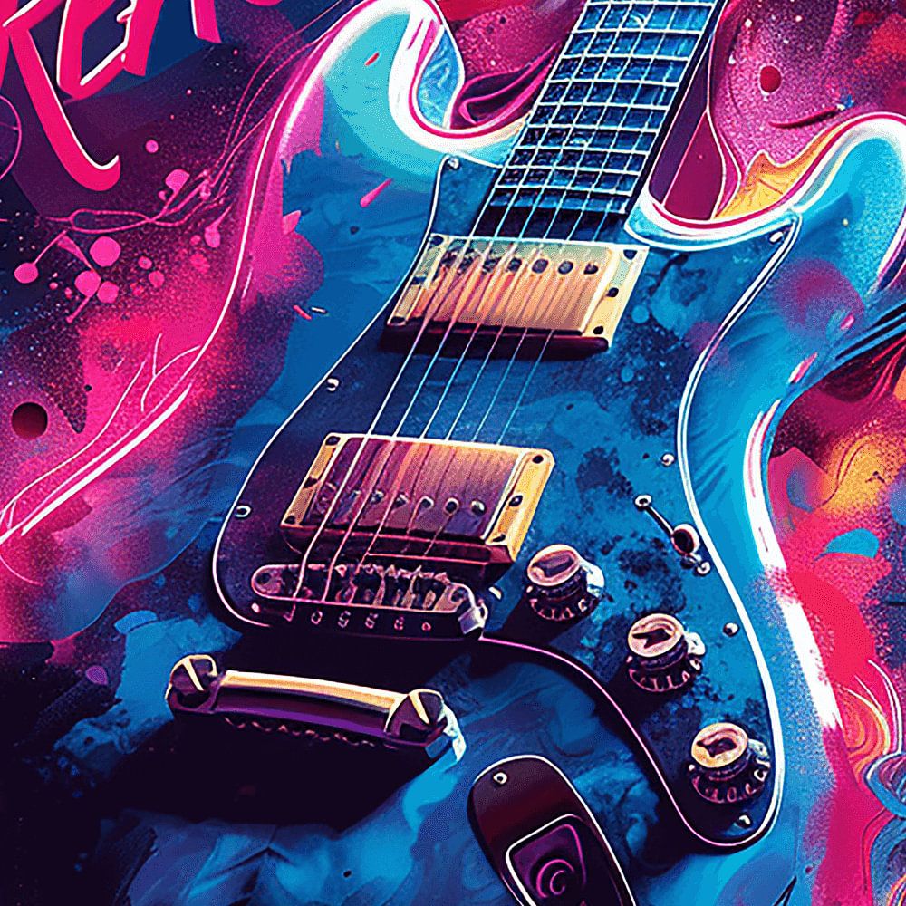 "Rock Reach" fängt die Energie und Intensität von Live-Rockmusik ein. Die leuchtend farbige E-Gitarre scheint vor dem Hintergrund explosiver Farben und dynamischer Formen zu leuchten.