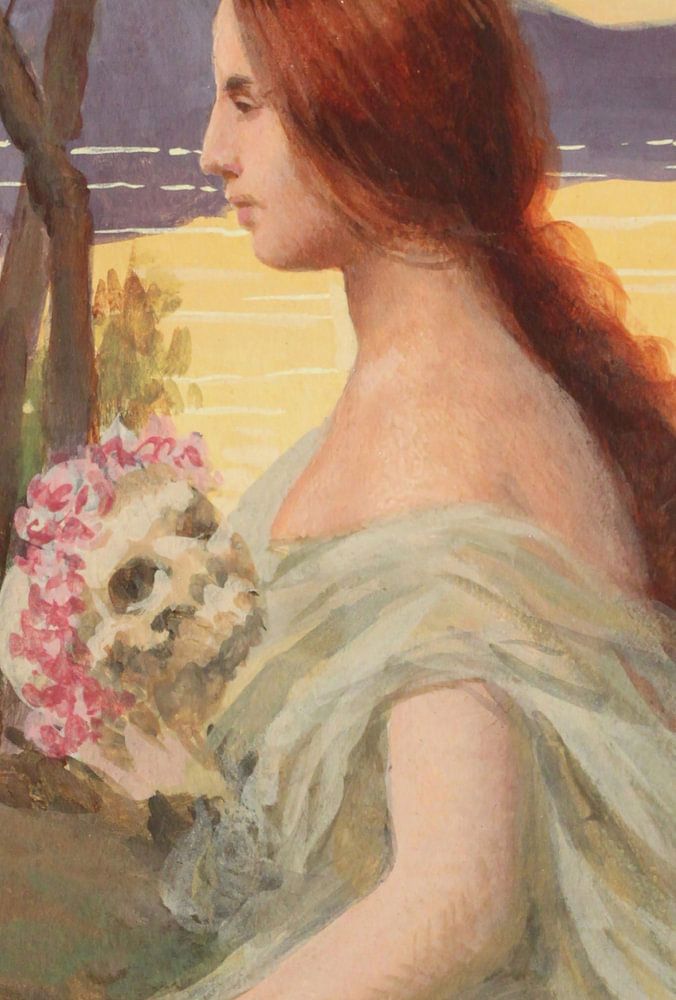 Rodolfo Amoedo-Feminine Figur mit einem Totenkopf mit Blumen.