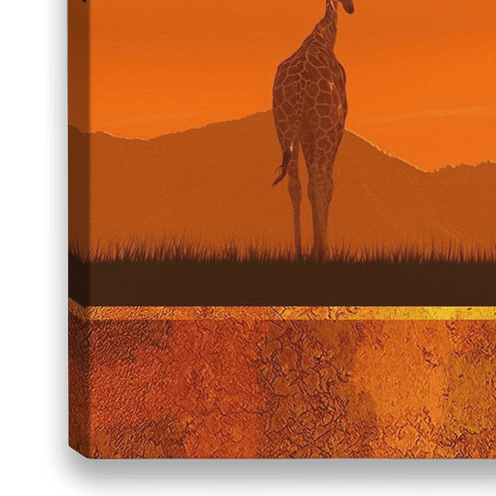 Afrika ganz romantisch mit Zebras, Giraffen und Vögeln. Tierfelle in Gold- und Brauntonung am oberen und unteren Bildrand, wirken wie eine Rahmung in glänzender Optik. Der Sonnenuntergang hinter einem Baum hervor leuchtend, taucht das Werk in eine warme orange Tonung. Wieder etwas Romantisches aus der Kreativwerkstatt Mausopardia,…