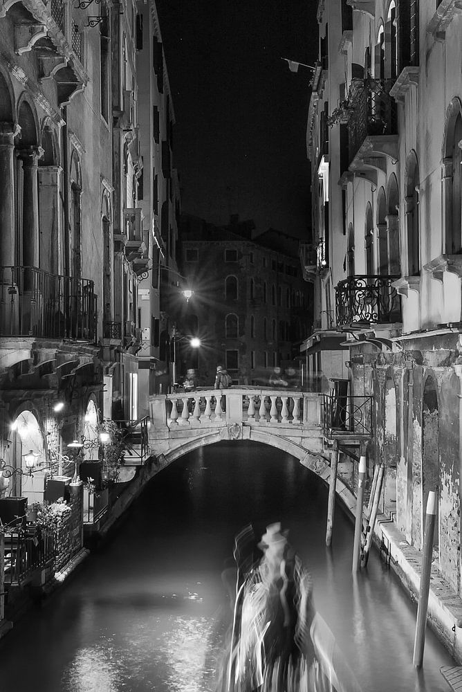 Romantische Gasse mit kleinem Restaurant an einem Kanal und vorbeifahrender Gondel.