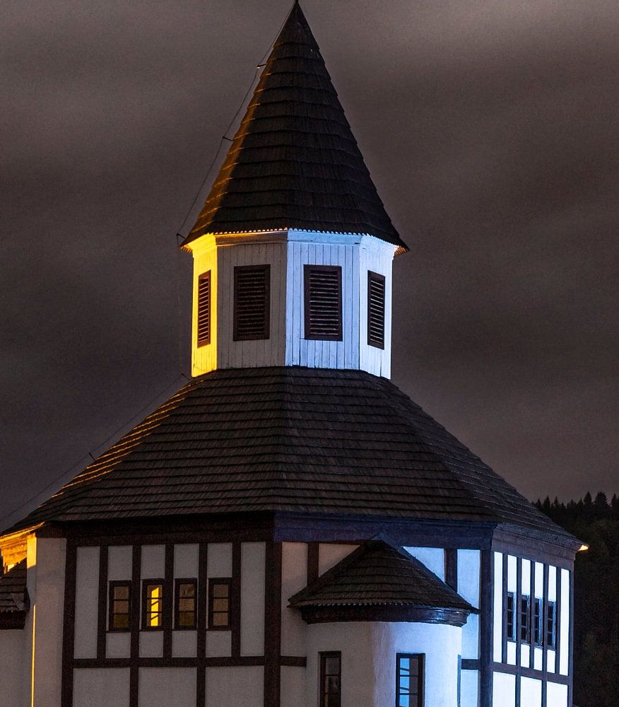 Die Kirche wird in der Nacht mit verschieden farbigem Licht angestrahlt.