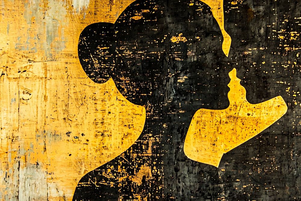 Dieses beeindruckende Kunstwerk zeigt zwei Silhouetten in einer intimen und romantischen Umarmung, die durch einen goldenen Hintergrund perfekt akzentuiert wird. Die Kombination aus abstrakten Texturen und einem minimalistischen Design macht dieses Gemälde zu einer vielseitigen Ergänzung für jedes Interieur. Der subtile Kontrast zwischen den dunklen Silhouetten und den warmen Goldtönen schafft eine einzigartige Atmosphäre von Eleganz und Leidenschaft. Ideal für das Wohnzimmer, das Schlafzimmer oder den Flur, strahlt dieses Kunstwerk Romantik und Raffinesse aus.