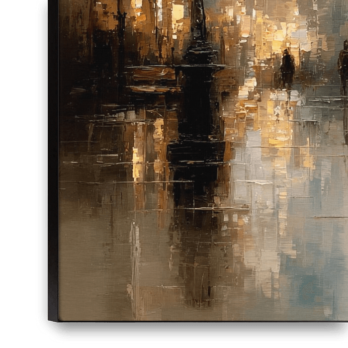 Zwei Paare gehen in der Abenddämmerung gemeinsam durch eine verregnete Straße. Die Reflexionen auf dem nassen Bürgersteig schaffen eine romantische Stimmung. Warme Straßenlaternen bilden einen schönen Kontrast zu den kühlen Tönen der Umgebung. Der malerische Stil sorgt für Weichheit und Emotionen. Dieses Kunstwerk bringt Wärme und…