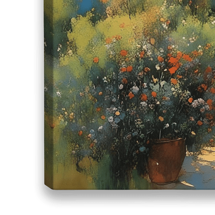 Ein malerisches, sonnendurchflutetes Haus ist von üppigen, farbenfrohen Blumen und Grünpflanzen umgeben, die ein Gefühl von Wärme und Ruhe vermitteln. Eine Steintreppe führt zum Eingang, der von Topfpflanzen und Wildblumen gesäumt ist und einen friedlichen Aufenthalt im Einklang mit der Natur suggeriert.