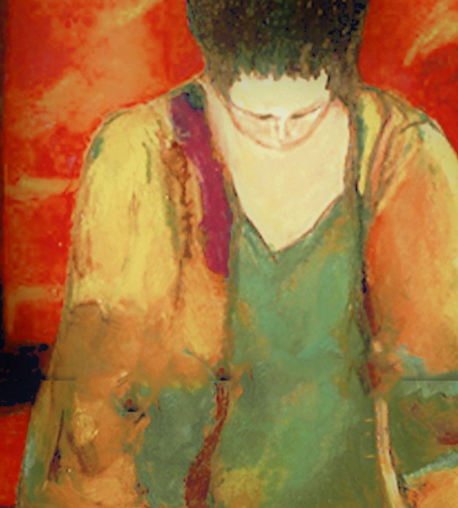 Ein figuratives romantisches Ölpastellporträt eines lesenden Mädchens in sanften Vintage-Farben. Ihre Strickjacke ist braun-beige mit Streifen in Grün und Türkis, ihr Oberteil ist zartgrün und sie trägt eine grüne Hose. Der Hintergrund ist braunrot mit etwas Gelb hier und da. Das gibt eine warme Atmosphäre.
