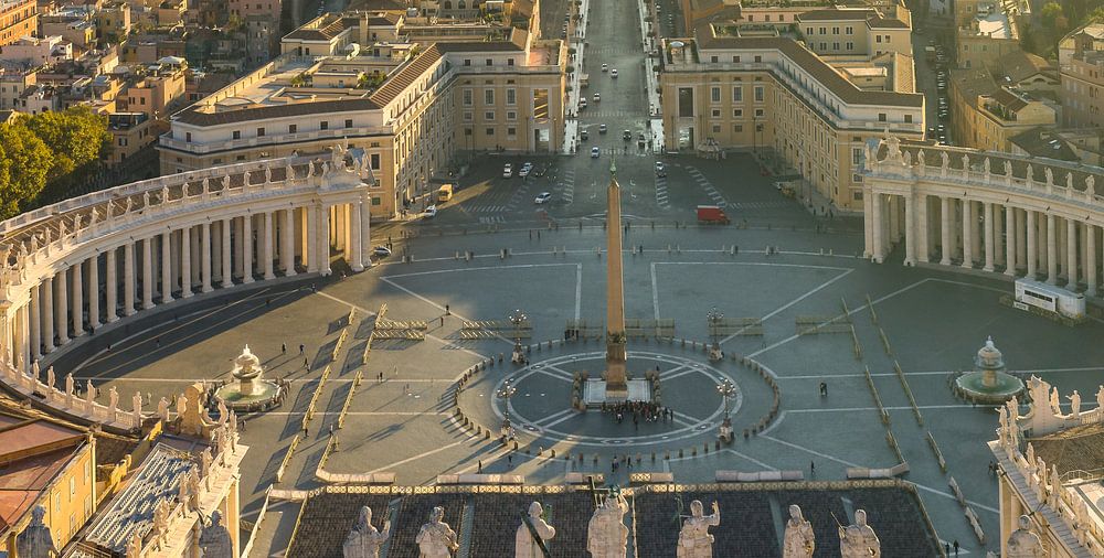 Het St. Pietersplein in Rome, gezien vanaf de St. Pietersbasiliek in de ochtendzon.