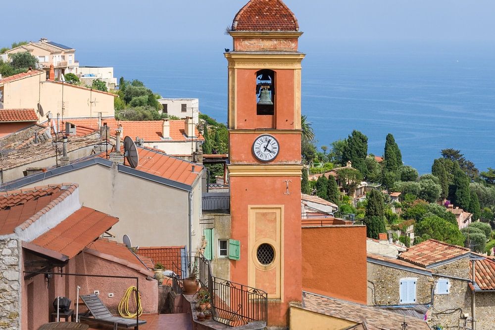 Das mittelalterliche Dorf Roquebrune (bei Menton) mit Blick auf das Mittelmeer.