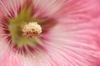 Nahaufnahme des Herzens einer rosa Blüte einer Stockrose (Alcea rosea)