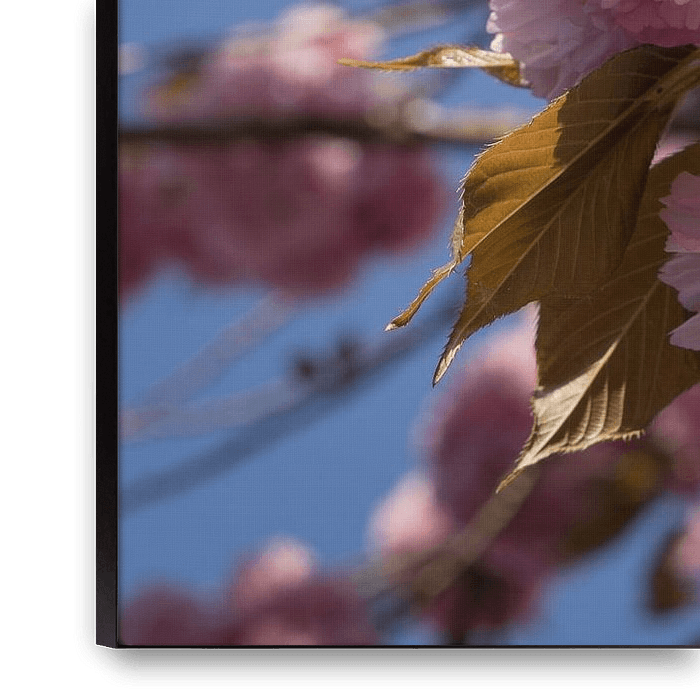 Bestelle dieses Blumen-Wandbild Rosa Blüten der Zierkirsche und blauer Himmel von Adriana Müller als Reproduktion auf Leinwand, Alu-Dibond, als Poster, Fototapete oder Acrylglasbild.