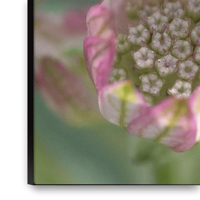 Bestelle das Foto Rosa Blume Astrantia von Bianca Muntinga als Reproduktion auf Leinwand, Alu-Dibond, als Poster, Fototapete oder Acrylglasbild.