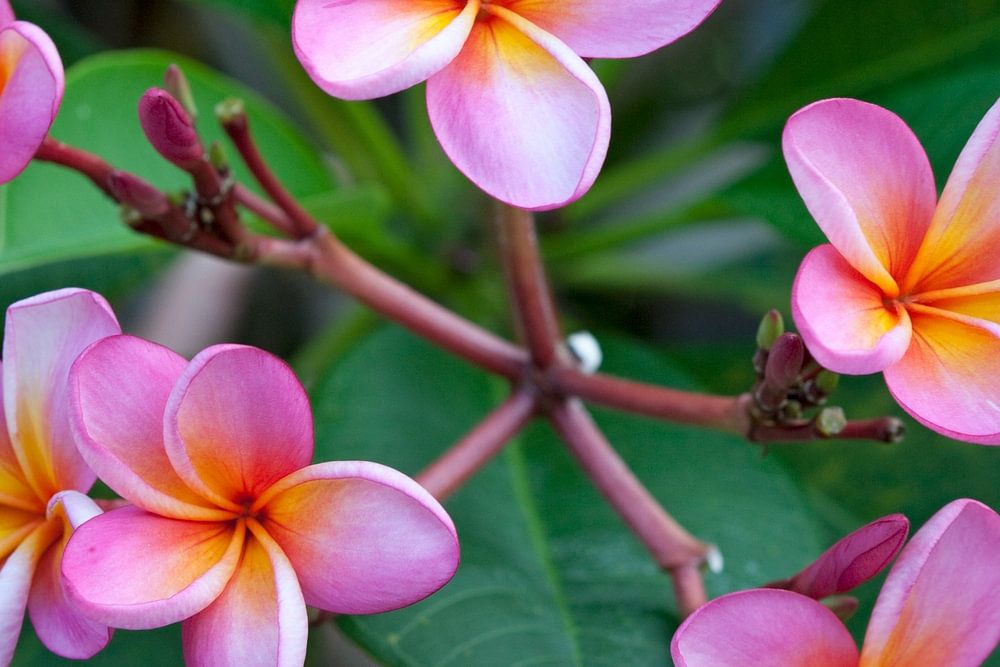 Tropische rosa Frangipani-Blüten, Plumeria, auch Tempelbaum genannt, an der Pflanze aus der Nähe