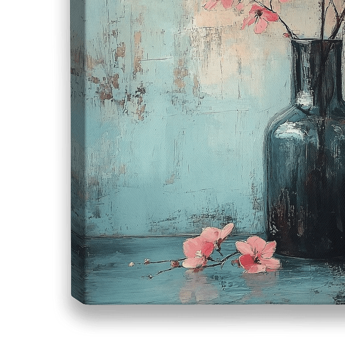 Dieses Kunstwerk zeigt ein Stillleben mit schlanken rosa Blütenzweigen, die aus einer dunklen Glasvase zu wachsen scheinen, vor einem Hintergrund aus verwitterten Blau- und Orangetönen. Die Blüten kontrastieren wunderbar mit der robusten, verwitterten Vase und dem rauen Holzbecher. Das Werk strahlt eine Atmosphäre vergänglicher…