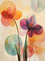 Pink Orange | Fröhliche Blumen - Dies ist ein abstraktes Blumenbild mit auffälligen großen Blumen in Rosa- und Orangetönen vor einem sanft verblassten Hintergrund mit runden Formen in Gelb, Blau und Weiß.